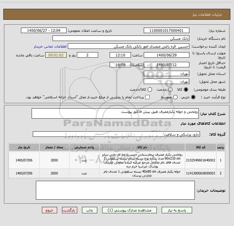 شرح کلی نیاز: روتختی و حوله یکبارمصرف طبق پیش فاکتور پیوست
