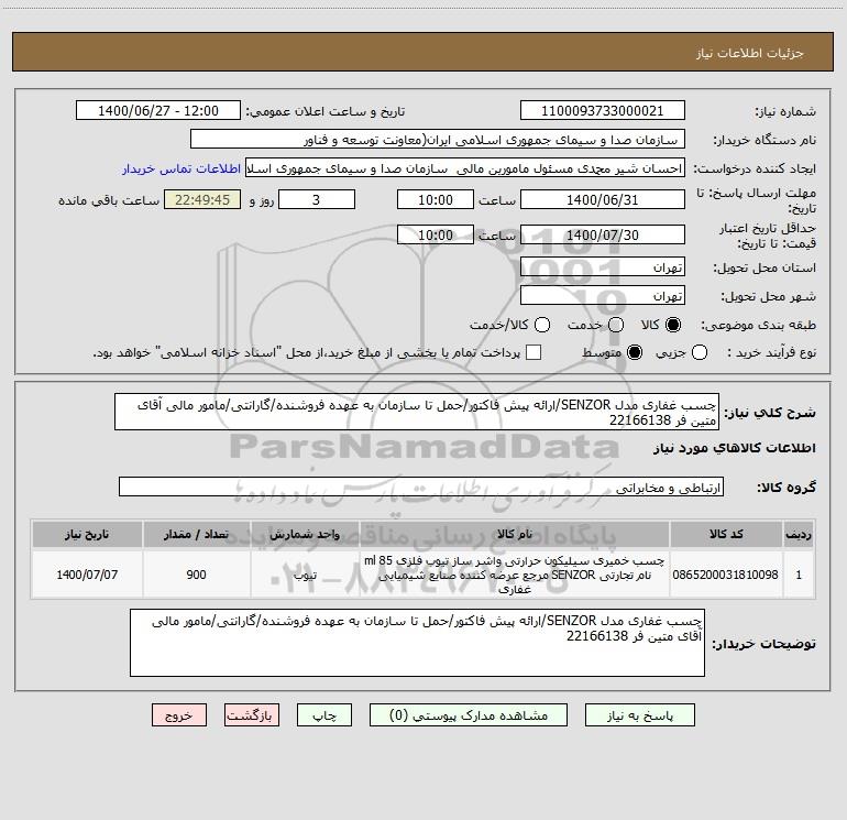 شرح کلی نیاز: چسب غفاری مدل SENZOR/ارائه پیش فاکتور/حمل تا سازمان به عهده فروشنده/گارانتی/مامور مالی آقای متین فر 22166138