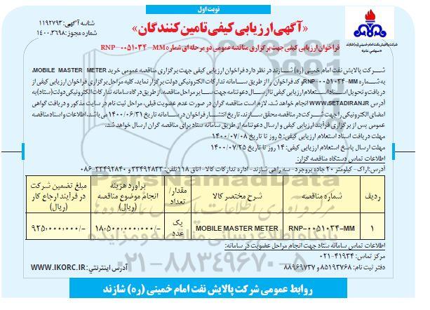 | RNP - 0051034 -MM | MOBILE MASTER METER | یک عدد | 18.500.000.000 | 925.000.000 |