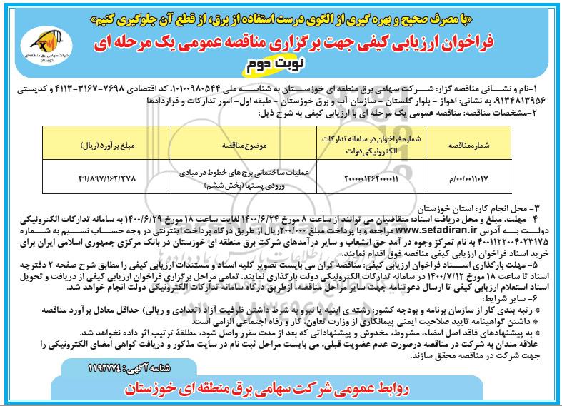1- نام و نشانی مناقصه گزار شرکت سهامی برق منطقه ای خوزستان به شناسه ملی 10100980544 کد اقتصادی 4113-3167-7698 و کد پستی 6134813956 به نشانی اهواز بلوار گلستان سازمان آب و برق خوزستان ساختمان شماره 2 شرکت سهامی برق منطقه ای خوزستان - ط سوم - دفتر قراردادها