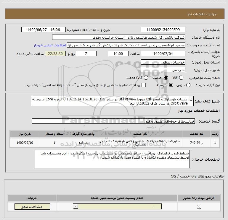 نام دستگاه خریدار:شرکت پالایش گاز شهید هاشمی نژاد استان خراسان رضوی