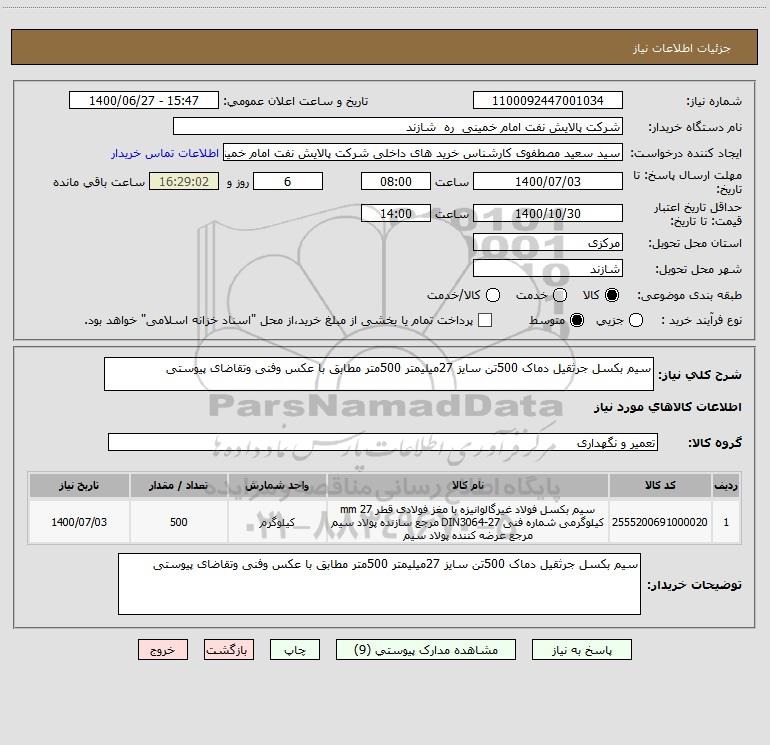 شرح کلی نیاز: سیم بکسل جرثقیل دماک 500تن سایز 27میلیمتر 500متر مطابق با عکس وفنی وتقاضای پیوستی