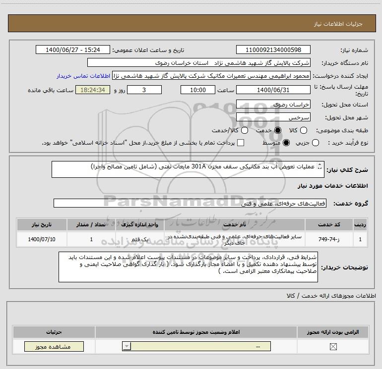نام دستگاه خریدار:شرکت پالایش گاز شهید هاشمی نژاد استان خراسان رضوی