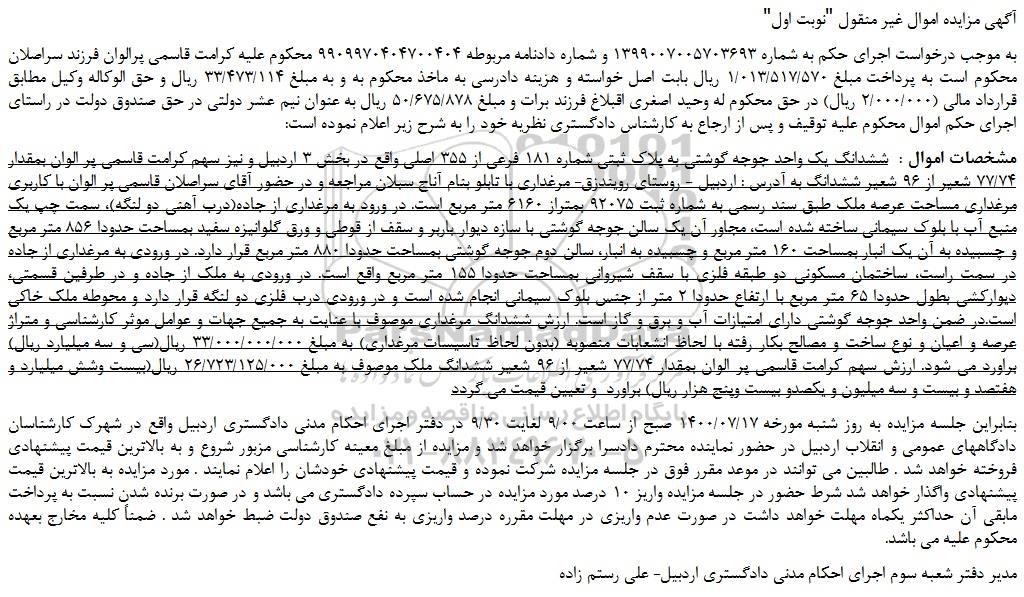 به موجب درخواست اجرای حکم به شماره 1399007005703693 و شماره دادنامه مربوطه 9909970404700404 محکوم علیه کرامت قاسمی پرالوان فرزند سراصلان محکوم است به پرداخت مبلغ 1/013/517/570 ریال بابت اصل خواسته و هزینه دادرسی به ماخذ محکوم به و به مبلغ 33/473/114 ریال و حق الوکاله وکیل مطابق قرارداد مالی (2/000/000 ریال) در حق محکوم له وحید اصغری اقبلاغ فرزند برات و مبلغ 50/675/878 ریال به عنوان نیم عشر دولتی در حق صندوق دولت در راستای اجرای حکم اموال محکوم علیه توقیف و پس از ارجاع به کارشناس دادگستری نظریه خود را به شرح زیر اعلام نموده است: