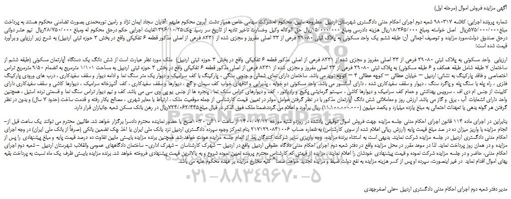 شماره پرونده اجرایی: کلاسه 980317 شعبه دوم اجرای احکام مدنی دادگستری شهرستان اردبیل مطروحه مابین، محکوم له:شرکت سهامی خاص همیار دشت آبرون محکوم علیهم :آقایان سجاد ایمان نژاد و رامین نورمحمدی بصورت تضامنی محکوم هستند به پرداخت مبلغ575/000/000ریال اصل خواسته ومبلغ 18/365/000ریال هزینه دادرسی ومبلغ 15/000/000ریال حق الوکاله وکیل وخسارت تاخیر تادیه از تاریخ سر رسید چک1396/10/25لغایت اجرایی حکم درحق محکوم له ومبلغ 28/750/000ریال نیم عشر دولتی درحق صندوق دولت،مورد مزایده و توصیف اجمالی آن: طبقه ششم یک واحد مسکونی به پلاک ثبتی 29080 فرعی از 33 اصلی مفروز و مجزی شده از 8231 فرعی از اصلی مذکور قطعه 6 تفکیکی واقع در بخش 3 حوزه ثبتی اردبیل) به شرح زیر ارزیابی و برآورد قیمت شده است؛