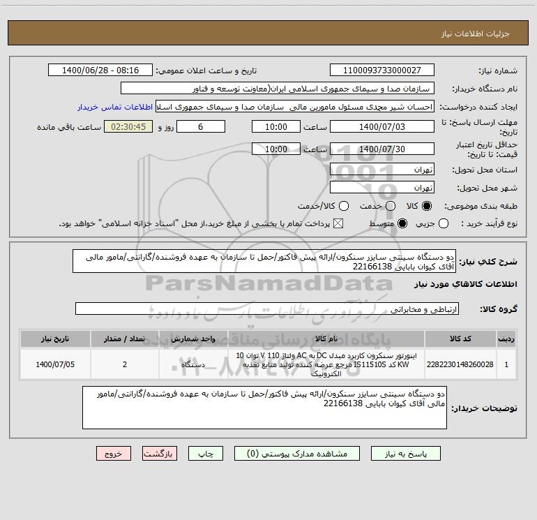 شرح کلی نیاز: دو دستگاه سینتی سایزر سنکرون/ارائه پیش فاکتور/حمل تا سازمان به عهده فروشنده/گارانتی/مامور مالی آقای کیوان بابایی 22166138