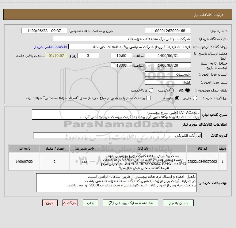 شرح کلی نیاز: تابلویLV- AC (طبق شرح پیوست)