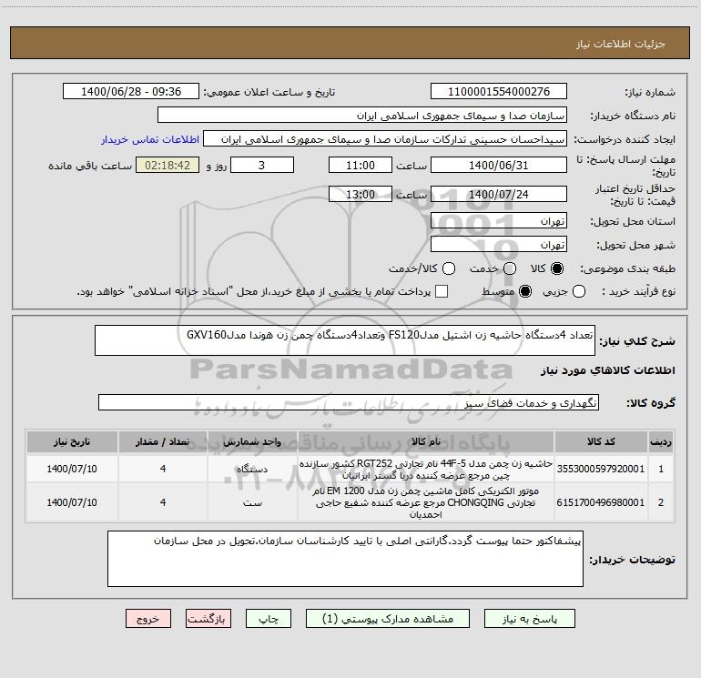 شرح کلی نیاز: تعداد 4دستگاه حاشیه زن اشتیل مدلFS120 وتعداد4دستگاه چمن زن هوندا مدلGXV160