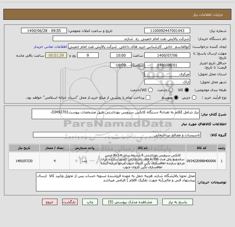 شرح کلی نیاز: نیاز شامل 2قلم به تعداد4 دستگاه کانکس سرویس بهداشتی طبق مشخصات پیوست33492701-