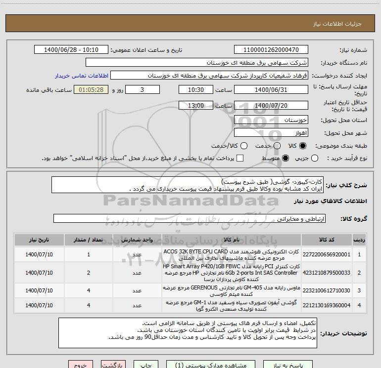 شرح کلی نیاز: کارت-کیبورد- گوشی( طبق شرح پیوست) ایران کد مشابه بوده وکالا طبق فرم پیشنهاد قیمت پیوست خریداری می گردد .