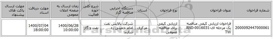 | 2000092447000061 | فراخوان ارزیابی کیفی مناقصه یک مرحله ایRND-0016031-TW | ارزیابی کیفی برای مناقصه عمومی | مرکزی | شرکت پالایش نفت امام خمینی ره شازند | نفت و گاز | 1400/06/28 10:00:00 | 1400/07/04 18:00:00 |