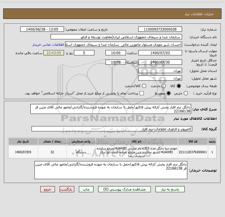 شرح کلی نیاز: دانگل نرم افزار پخش /ارائه پیش فاکتور/حمل تا سازمان به عهده فروشنده/گارانتی/مامور مالی آقای متین فر 22166138