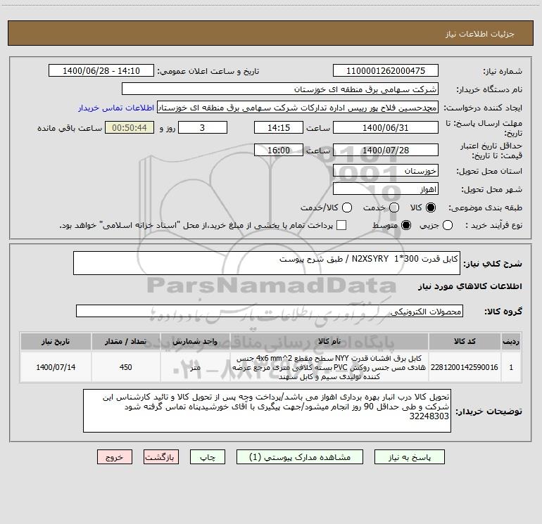 شرح کلی نیاز: کابل قدرت N2XSYRY 1*300 / طبق شرح پیوست