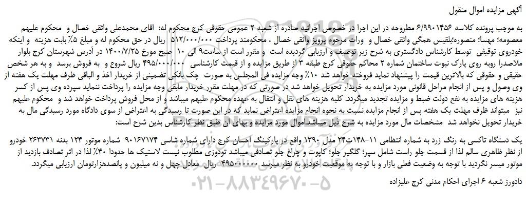به موجب پرونده کلاسه 6/9901456 مطروحه در این اجرا در خصوص اجرائیه صادره از شعبه 2 عمومی حقوقی کرج محکوم له: اقای محمدعلی واثقی خصال و محکوم علیهم معصومه؛ مهسا؛ منصوره؛بلقیس همگی واثقی خصال و وراث مرحوم پرویز واثقی خصال ، محکومند پرداخت 512/000/000 ریال در حق محکوم له و مبلغ 5% بابت هزینه و اینکه خودروی توقیفی توسط کارشناس دادگستری به شرح زیر توصیف و ارزیابی گردیده است و مقرر است از ساعت9 الی 10 صبح مورخ 1400/7/25 در آدرس شهرستان کرج بلوار ملاصدرا روبه روی پارک نبوت ساختمان شماره 2 محاکم حقوقی کرج طبقه 3 از طریق مزایده و از قیمت کارشناسی 495/000/000 ریال شروع و به فروش برسد و به هر شخص حقیقی و حقوقی که بالاترین قیمت را پیشنهاد نماید فروخته خواهد شد 10% وجه مزایده فی المجلس به صورت چک بانکی تضمینی از خریدار اخذ و الباقی ظرف مهلت یک هفته از وی وصول و پس از انجام مراحل قانونی مورد مزایده به خریدار تحویل خواهد شد در صورتی که در مهلت مقرر خریدار مابقی وجه مزایده را پرداخت ننماید سپرده وی پس از کسر هزینه های مزایده به نفع دولت ضبط و مزایده تجدید میگردد. کلیه هزینه های نقل و انتقال به عهده محکوم علیهم میباشد و از محل فروش پرداخت خواهد شد و محکوم علیهم نیز میتواند ظرف مهلت یک هفته پس از انجام مزایده نسبت به نحوه انجام مزایده اعتراض نماید که در این صورت تا رسیدگی به اعتراض از سوی دادگاه مورد رسیدگی مال به خریدار تحویل نخواهد شد مشخصات مال مورد مزایده به شرح ذیل میباشد.اموال مورد مزایده و بهای ان طبق نظر کارشناس بدین شرح است: