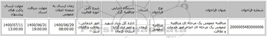 2000005483000006مناقصه عمومی یک مرحله ای مناقصه عمومی یک مرحله ای انجام امور خدمات و نظافتمناقصه عمومیکرماناداره کل بنیاد شهید و امور ایثارگران استان کرمانامور خدماتی ، نظافت و فضای سبز1400/06/29 08:00:001400/06/31 19:00:001400/07/11 13:00:00