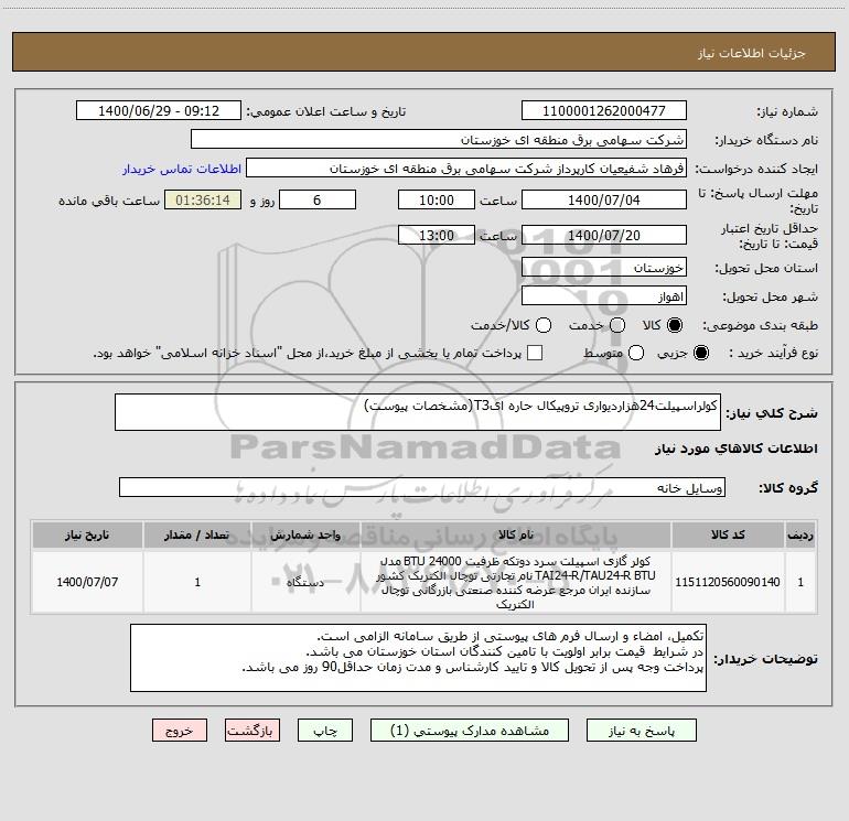 شرح کلی نیاز: کولراسپیلت24هزاردیواری تروپیکال حاره ایT3(مشخصات پیوست)