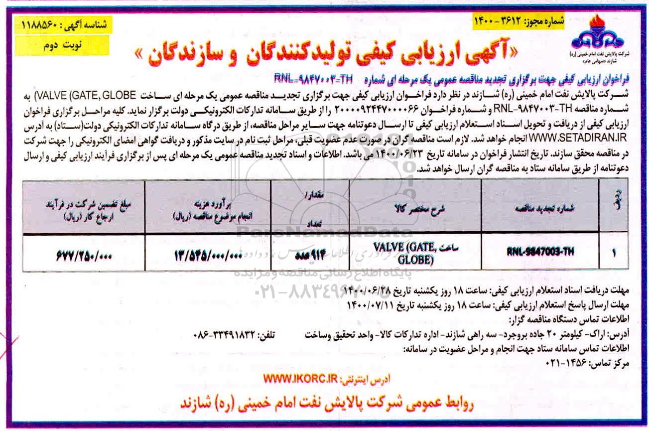 شرکت پالایش نفت امام خمینی (ره) شازند در نظر دارد فراخوان ارزیابی کیفی جهت برگزاری تجدید مناقصه عمومی دو مرحله ای ساخت (VALVE (GAGE, GLOBE  به شماره RNL- 9847003-TH و شماره فراخوان 20000924470000066 را از طریق سامانه تدارکات الکترونیکی دولت برگزار نماید کلیه مراحل برگزاری فراخوان ارزیابی کیفی از دریافت و تحویل اسناد استعلام ارزیابی کیفی تا ارسال دعوت نامه جهت سایر مراحل مناقصه از طریق درگاه  سامانه تدارکات الکترونیکی دولت ستاد به آدرس ستاد ایران انجام خواهد شد لازم است مناقصه گران در صورت عدم عضویت قبلی مراحل ثبت نام در سایت مذکور و دریافت گواهی امضای الکترونیکی ار جهت شرکت در مناقصه محقق سازند تاریخ انتشار فراخوان در سامانه تاریخ 1400.6.23  می باشد اطلاعات و اسناد تجدید مناقصه عمومی پس از برگزاری فرایند ارزیابی کیفی و ارسال دعوتنامه از طریق سامانه ستاد به مناقصه گران ارسال خواهد شد