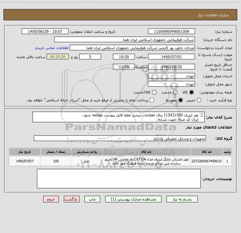 شرح کلی نیاز: تونر لیزری 1300(13A) برای اطلاعات بیشتر لطفا فایل پیوست مطالعه شود.
