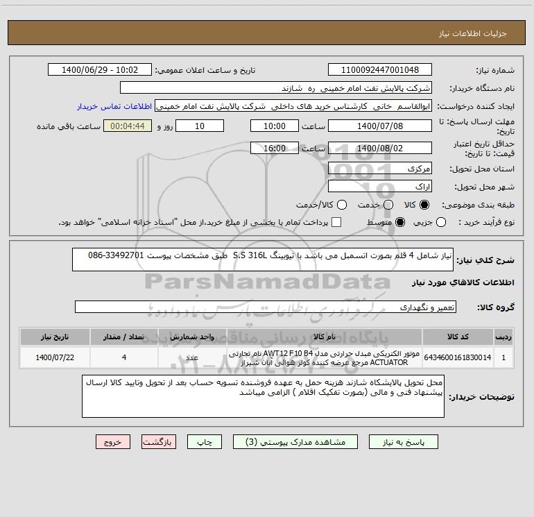 استعلام نیاز شامل 4 قلم بصورت اتسمبل می باشد با تیوبینگ S.S 316L طبق مشخصات پیوست 33492701-086, استعلام نیاز شامل 4 قلم بصورت اتسمبل می باشد با تیوبینگ S.S 316L طبق مشخصات پیوست 33492701-086