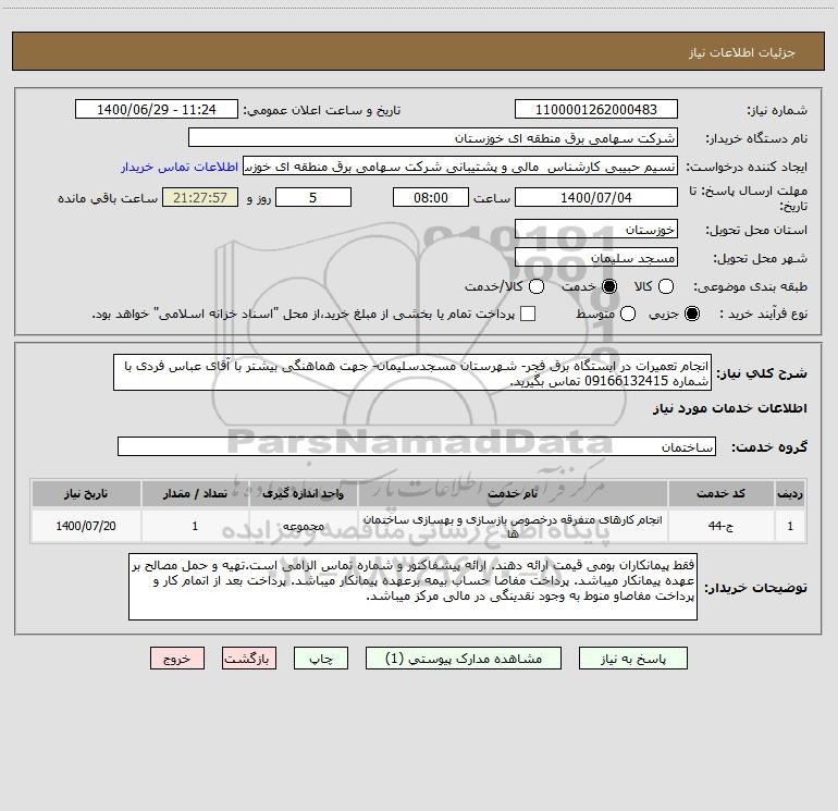 شرح کلی نیاز: انجام تعمیرات در ایستگاه برق فجر- شهرستان مسجدسلیمان- جهت هماهنگی بیشتر با آقای عباس فردی با شماره 09166132415 تماس بگیرید.