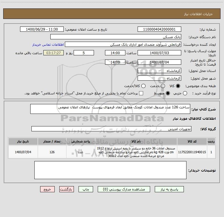 شرح کلی نیاز: ساخت 126 عدد صندوق امانات کوچک مطابق ابعاد فرمهای پیوست نیازهای اعلان عمومی