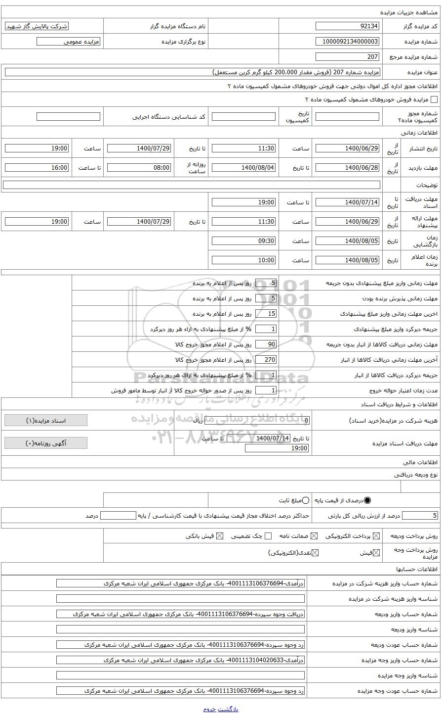 | شماره پارتی | 1100092134000003 | نوع برگزاری مزایده | مزایده عمومی | |