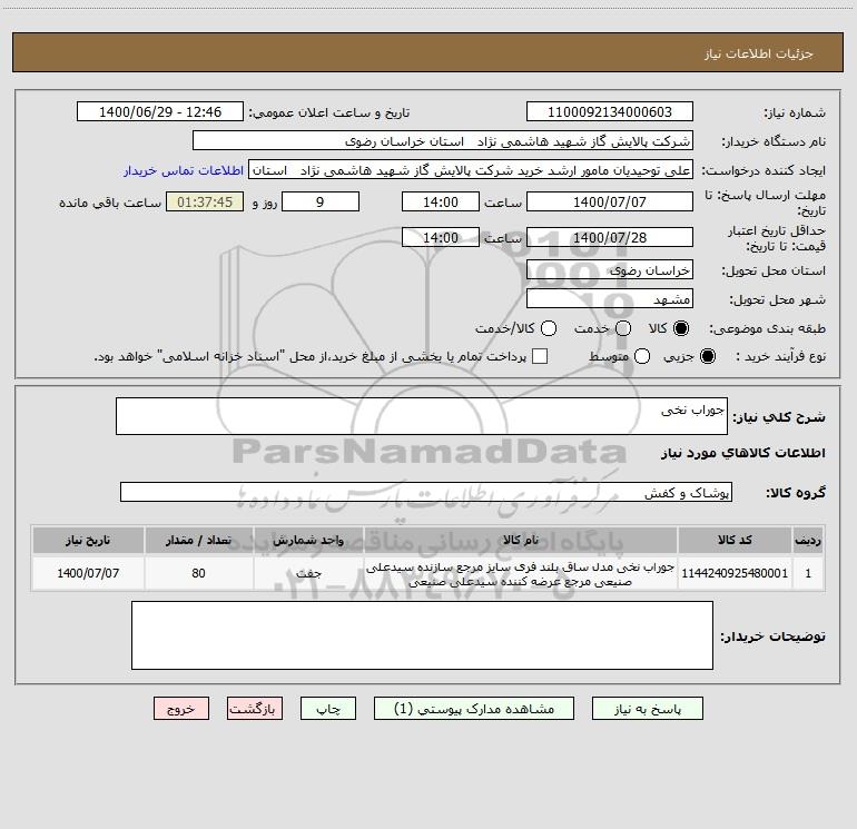 نام دستگاه خریدار:شرکت پالایش گاز شهید هاشمی نژاد استان خراسان رضوی