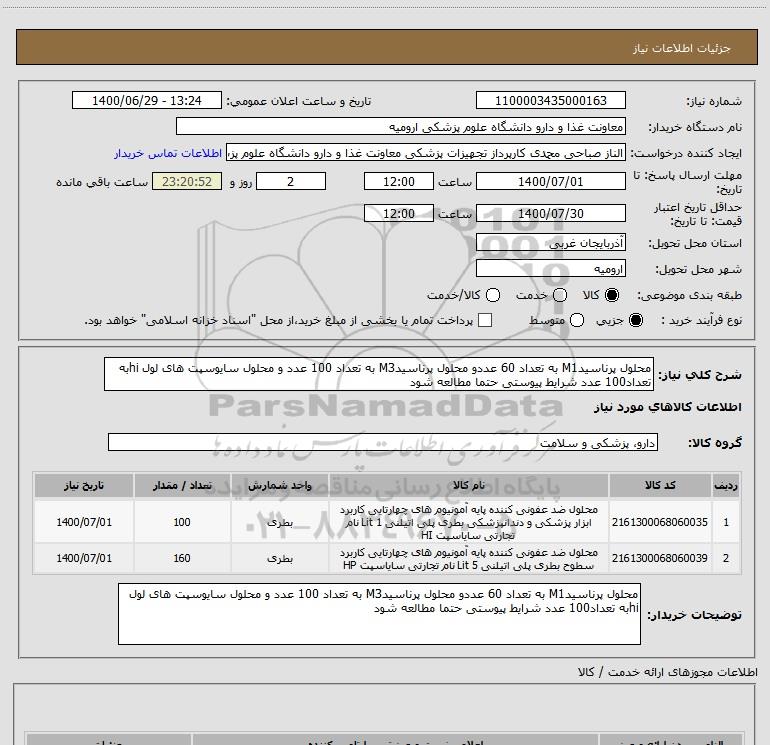 استعلام محلول پرناسیدM1 به تعداد 60 عددو محلول پرناسیدM3 به تعداد 100 عدد و محلول سایوسپت های لول hiبه تعداد100 عدد شرایط پیوستی حتما مطالعه شود, استعلام محلول پرناسیدM1 به تعداد 60 عددو محلول پرناسیدM3 به تعداد 100 عدد و محلول سایوسپت های لول hiبه تعداد100 عدد شرایط پیوستی حتما مطالعه شود