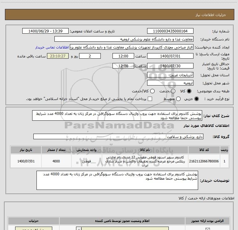 شرح کلی نیاز: پوشش کاندوم برای استفاده جهت پروب واژینال دستگاه سونوگرافی در مرکز زنان به تعداد 4000 عدد شرایط پیوستی حتما مطالعه شود