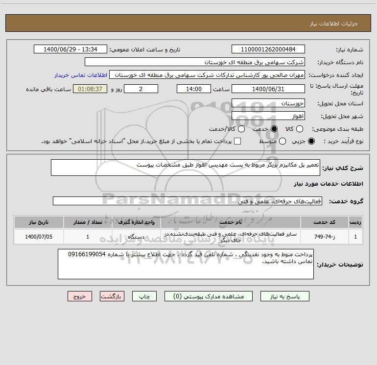 شرح کلی نیاز: تعمیر پل مکانیزم بریکر مربوط به پست مهدیس اهواز طبق مشخصات پیوست