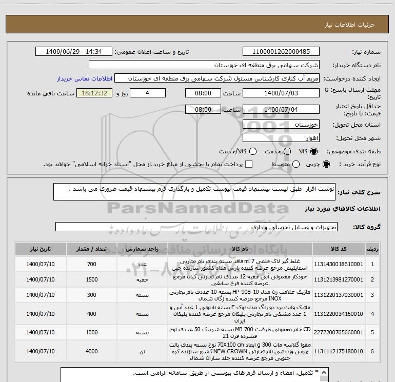 شرح کلی نیاز: نوشت افزار طبق لیست پیشنهاد قیمت پیوست تکمیل و بارگذاری فرم پیشنهاد قیمت ضروری می باشد .