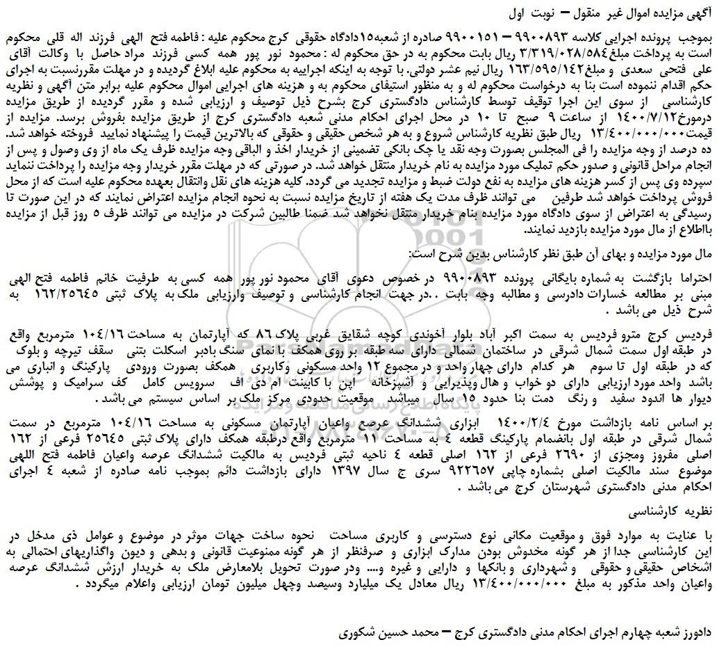 بموجب  پرونده اجرایی کلاسه 9900893 – 9900151 صادره از شعبه15دادگاه حقوقی  کرج محکوم علیه : فاطمه فتح  الهی  فرزند  اله  قلی  محکوم است به پرداخت مبلغ3/319/028/584 ریال بابت محکوم به در حق محکوم له : محمود  نور  پور  همه  کسی  فرزند  مراد حاصل  با  وکالت  آقای  علی  فتحی  سعدی  و مبلغ163/595/142 ریال نیم عشر دولتی. با توجه به اینکه اجراییه به محکوم علیه ابلاغ گردیده و در مهلت مقررنسبت به اجرای حکم اقدام ننموده است بنا به درخواست محکوم له و به منظور استیفای محکوم به و هزینه های اجرایی اموال محکوم علیه برابر متن آگهی و نظریه کارشناسی  از سوی این اجرا توقیف توسط کارشناس دادگستری کرج بشرح ذیل توصیف و ارزیابی شده و مقرر گردیده از طریق مزایده درمورخ1400/7/12 از ساعت 9 صبح تا  10 در محل اجرای احکام مدنی شعبه دادگستری کرج از طریق مزایده بفروش برسد. مزایده از قیمت13/400/000/000  ریال طبق نظریه کارشناس شروع و به هر شخص حقیقی و حقوقی که بالاترین قیمت را پیشنهاد نمایید  فروخته خواهد شد. ده درصد از وجه مزایده را فی المجلس بصورت وجه نقد یا چک بانکی تضمینی از خریدار اخذ و الباقی وجه مزایده ظرف یک ماه از وی وصول و پس از انجام مراحل قانونی و صدور حکم تملیک مورد مزایده به نام خریدار منتقل خواهد شد. در صورتی که در مهلت مقرر خریدار وجه مزایده را پرداخت ننماید سپرده وی پس از کسر هزینه های مزایده به نفع دولت ضبط و مزایده تجدید می گردد. کلیه هزینه های نقل وانتقال بعهده محکوم علیه است که از محل فروش پرداخت خواهد شد طرفین    می توانند ظرف مدت یک هفته از تاریخ مزایده نسبت به نحوه انجام مزایده اعتراض نمایند که در این صورت تا رسیدگی به اعتراض از سوی دادگاه مورد مزایده بنام خریدار منتقل نخواهد شد ضمنا طالبین شرکت در مزایده می توانند ظرف 5 روز قبل از مزایده بااطلاع از مال مورد مزایده بازدید نمایند.