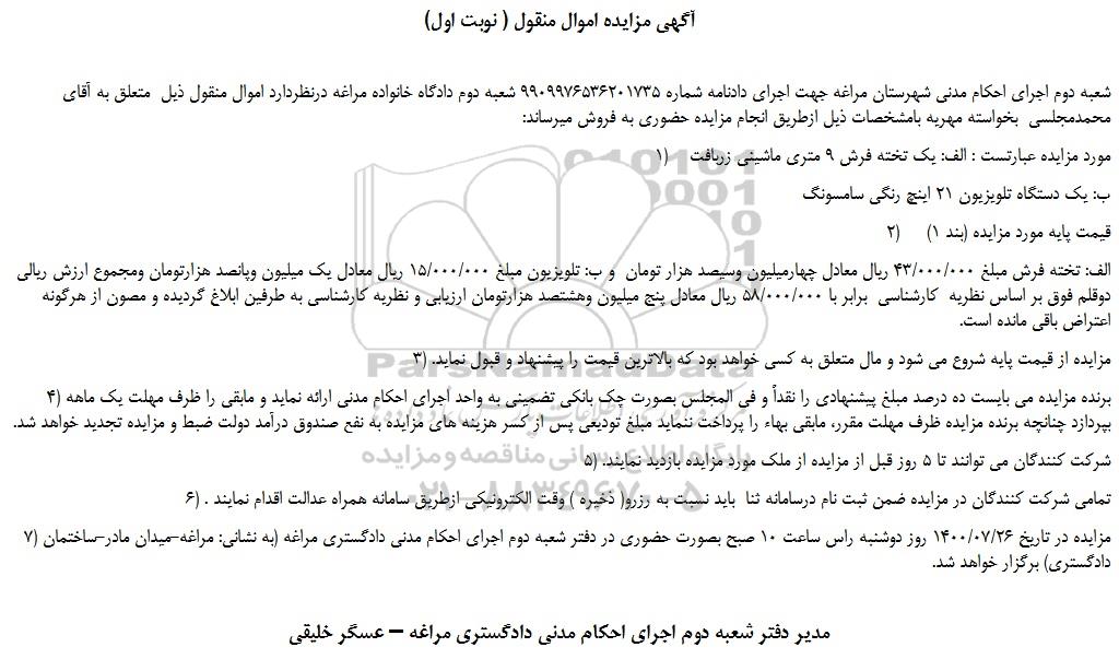 شعبه دوم اجرای احکام مدنی شهرستان مراغه جهت اجرای دادنامه شماره 9909976536201735 شعبه دوم دادگاه خانواده مراغه درنظردارد اموال منقول ذیل متعلق به آقای محمدمجلسی بخواسته مهریه بامشخصات ذیل ازطریق انجام مزایده حضوری به فروش میرساند:
