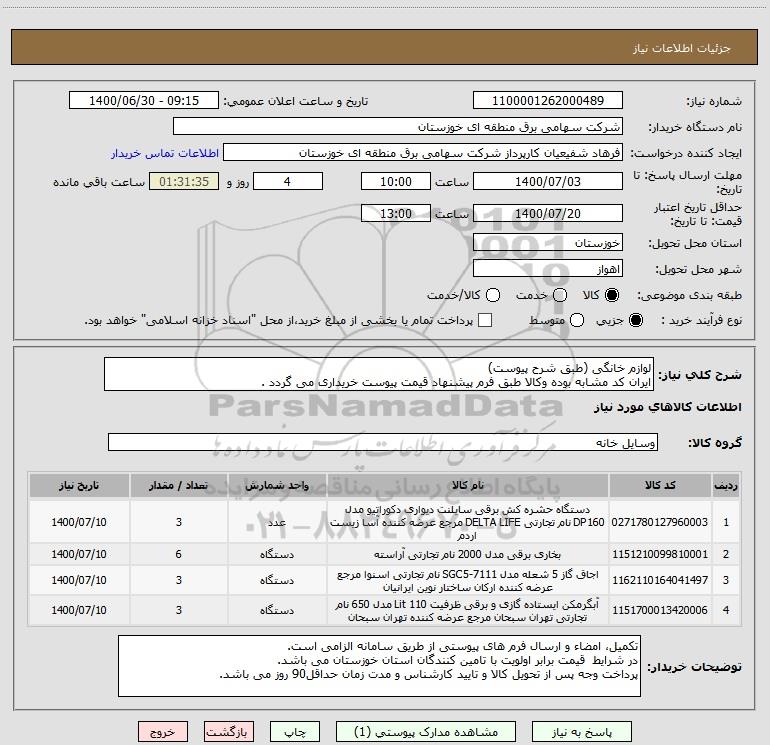 شرح کلی نیاز: لوازم خانگی (طبق شرح پیوست)