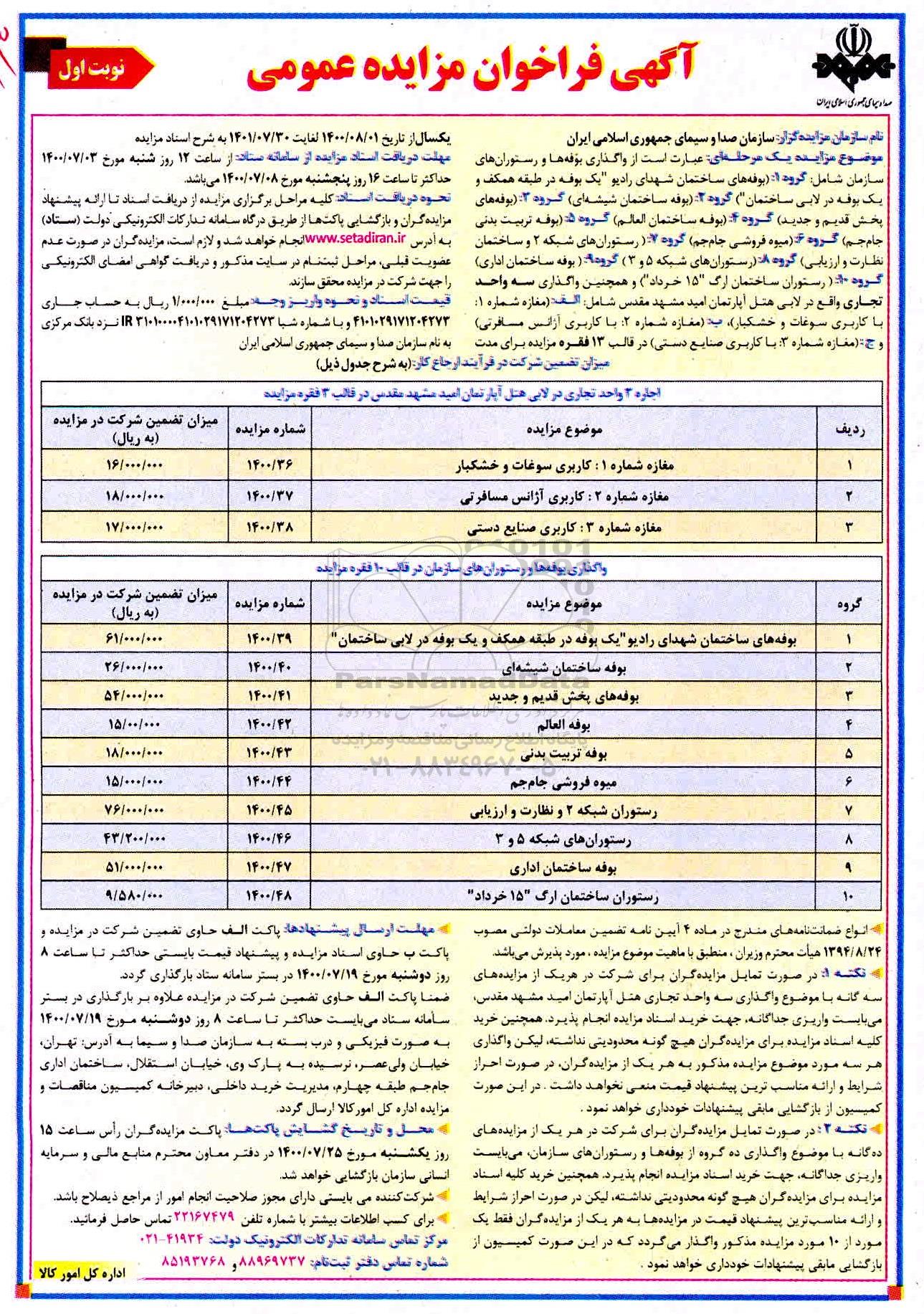 گروه 5: بوفه تربیت بدنی جام جم گروه 6: میوه فروشی جام جم گروه 7: رستورانهای شبکه 2 و ساختمان نظارت و ارزیابی گروه 8: رستورانهای شبکه 5 و 3 گروه 9: بوفه ساختمان اداری گروه 10: رستوران ساختمان ارگ 15 خرداد و همچنین واگذاری سه واحد تجاری واقع در لابی هتل آپارتمان امید مشهد مقدس شامل الف: مغازه شماره 1 با کاربری سوغات و خشکبار ب: مغازه شماره 2 با کاربری آژانس مسافرتی و ج: مغازه شماره 3 با کاربری صنایع دستی در قالب 13 فقره مزایده برای مدت یکسال از تاریخ 1400.8.1 الی 1401.7.30 به شرح اسناد مزایده