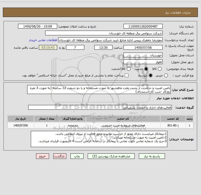 شرح کلی نیاز: تامین امنیت و حراست از پست بعثت ماهشهر به صورت مسلحانه و با دو شیفت 12 ساعته (به صورت 3 نفره روزکار -شب کار-استندبای)