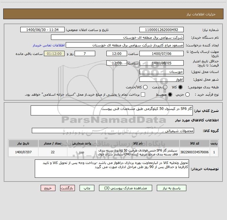شرح کلی نیاز: گاز SF6 در کپسول 50 کیلوگرمی طبق مشخصات فنی پیوست