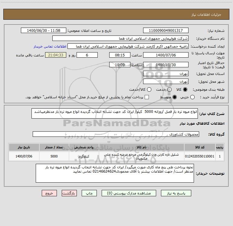 شرح کلی نیاز: انواع میوه تره بار فصل /روزانه 5000 کیلو/ ایران کد جهت تشابه انتخاب گردیده انواع میوه تره بار مدنظرمیباشد