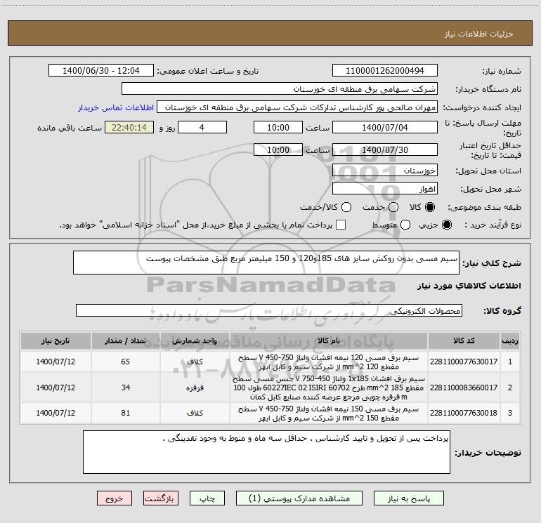 شرح کلی نیاز: سیم مسی بدون روکش سایز های 185و120 و 150 میلیمتر مربع طبق مشخصات پیوست