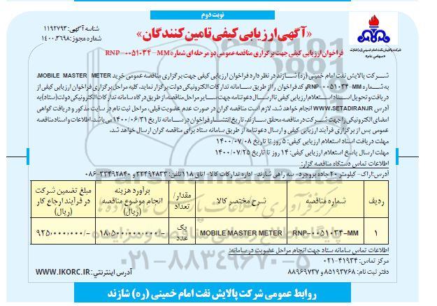 | RNP - 0051034 -MM | MOBILE MASTER METER | یک عدد | 18.500.000.000 | 925.000.000 |