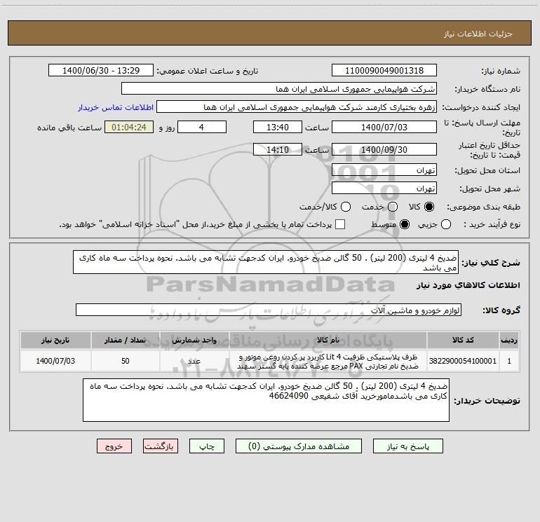 شرح کلی نیاز: ضدیخ 4 لیتری (200 لیتر) . 50 گالن ضدیخ خودرو. ایران کدجهت تشابه می باشد. نحوه پرداخت سه ماه کاری می باشد