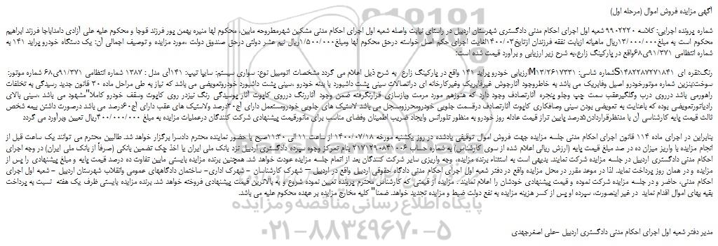 شماره پرونده اجرایی: کلاسه 9902220 شعبه اول اجرای احکام مدنی دادگستری شهرستان اردبیل در راستای نیابت واصله شعبه اول اجرای احکام مدنی مشکین شهرمطروحه مابین، محکوم لها منیره بهمن پور فرزند قوجا و محکوم علیه علی آزادی دامداباجا فرزند ابراهیم محکوم است به مبلغ13/000/000ریال ماهیانه ازبابت نفقه فرزندان ازتایخ1400/03لغایت اجرای حکم اصل خواسته درحق محکوم لها ومبلغ1/500/000ریال نیم عشر دولتی درحق صندوق دولت ،مورد مزایده و توصیف اجمالی آن: یک دستگاه خودرو پراید 141 به شماره انتظامی 91/371ی68واقع در پارکینگ زارع،به شرح زیر ارزیابی و برآورد قیمت شده است؛