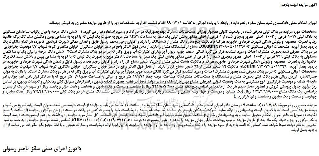 مشخصات مورد مزایده دو پلاک ثبتی معرفی شده در وضعیت کنونی همجوار ودارای مستحدثات مشترک بوده بصورتیکه در هم ادغام و مورد استفاده قرار می گیرد. 1- شش دانگ عرصه واعیان یکباب ساختمان مسکونی به پلاک ثبتی 1017 فرعی از 1003 اصلی مفروز ومجزی شده از 5 فرعی از اصلی مذکور بخش ثبتی یک سقز به مساحت 92.71 متر مربع به صورت یک نبش که با توجه به مشاعی بودن و داشتن سند تک برگ خانمها زینب نصرت معصومه و ونوش همگی شهرت فرهادی خاپورده هر کدام مالکیت پنج دهم دانگ مشاع از ششدانگ را دارند و آقایان رحیم محمد رسول فایق و لقمان همگی شهرت فرهادی خاپورده هر کدام مالکیت یک دانگ مشاع از ششدانگ مشاع را دارند از محل فوق الذکر واقع در سقز خیابان سنگبران خیابان منتظری کوچه شهاب 7با موقعیت جغرافیایی utm 613080 4011265 بازدید بعمل آورده مشخصات اعیانی مسکونی که در دو پلاک معرفی شده بصورت مشترک احداث و مورد استفاده قرار می گیرد کلنگی سقف چوب دیوار آجر ودارای امتیازات آب و برق وگاز که در هر دو پلاک مشترک است2- شش دانگ عرصه واعیان یکباب ساختمان مسکونی به پلاک ثبتی 739 فرعی از 1003 اصلی مفروز ومجزی شده از 6 فرعی از اصلی مذکور بخش ثبتی یک سقز به مساحت 89 متر مربع به صورت یک نبش که با توجه به مشاعی بودن و داشتن سند تک برگ خانمها زینب نصرت معصومه و ونوش همگی شهرت فرهادی خاپورده هر کدام مالکیت هشت شعیر مشاع از ش96 شعیر مشاع کل را دارند و آقایان رحیم محمد رسول فایق و لقمان همگی شهرت فرهادی خاپورده هر کدام مالکیت 16 شعیر مشاع از 96 شعیر مشاع کل را دارند از محل فوق الذکر واقع در سقز خیابان سنگبران خیابان منتظری کوچه شهاب 7با موقعیت جغرافیایی utm 613075 4011269 بازدید بعمل آورده مشخصات اعیانی مسکونی که در دو پلاک معرفی شده بصورت مشترک احداث و مورد استفاده قرار می گیرد کلنگی سقف چوب دیوار آجر ودارای امتیازات آب و برق وگاز که در هر دو پلاک مشترک است. باعنایت به موارد صدرالاشاره ارزش ریالی هردو پلاک ثبتی بصورت مشاع و ششدانگ با مستحدثات مشترک که مساحت عرصه جمعاً 181/71 متر مربع و اعیانی به مساحت حدوداً 95 متر مربع که با مد نظر قرار دادن اهم جوانب امر منجمله منطقه و موقعیت قرارگیری نوع دسترسی به ملک وضعیت کنونی تعریض مشاع بودن بازار ملک و سایر عوامل دخیل در قضیه بصورت تخلیه وبدون درنظرگرفتن سوابق ثبتی ومالکیتی و تعهدات ودیون، بر اساس ریز برآورد جدول پیوستی کروکی و تصاویر محل سهم هر یک ازخانمها بر اساس پنج دهم مشاع 621/807/500 ریال ( ششصد و بیست و یک میلیون و هشتصد و هفت هزار و پانصد ریال) و سهم هر یک از پسران براساس یک دانگ مشاع 1/243/615/000 ریال (یک میلیارد و دویست و چهل وسه میلیون و ششصد و پانزده هزار ریال)و جمعا بر اساس ششدانگ مشاع هر دو پلاک ثبتی 7/461/690/000 ریال (هفت میلیارد و چهارصد و شصت و یک میلیون و ششصد و نود هزار ریال)