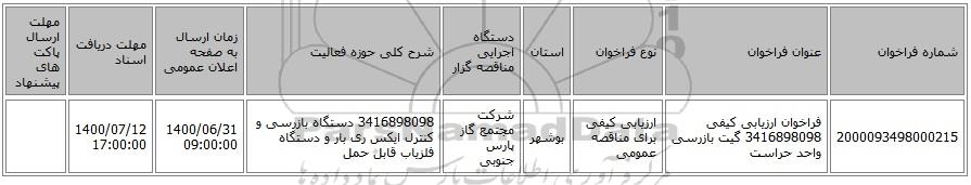 2000093498000215فراخوان ارزیابی کیفی 3416898098 گیت بازرسی واحد حراستارزیابی کیفی برای مناقصه عمومیبوشهرشرکت مجتمع گاز پارس جنوبی3416898098 دستگاه بازرسی و کنترل ایکس ری بار و دستگاه آشکار ساز فلز قابل حمل1400/06/31 09:00:001400/07/12 17:00:00