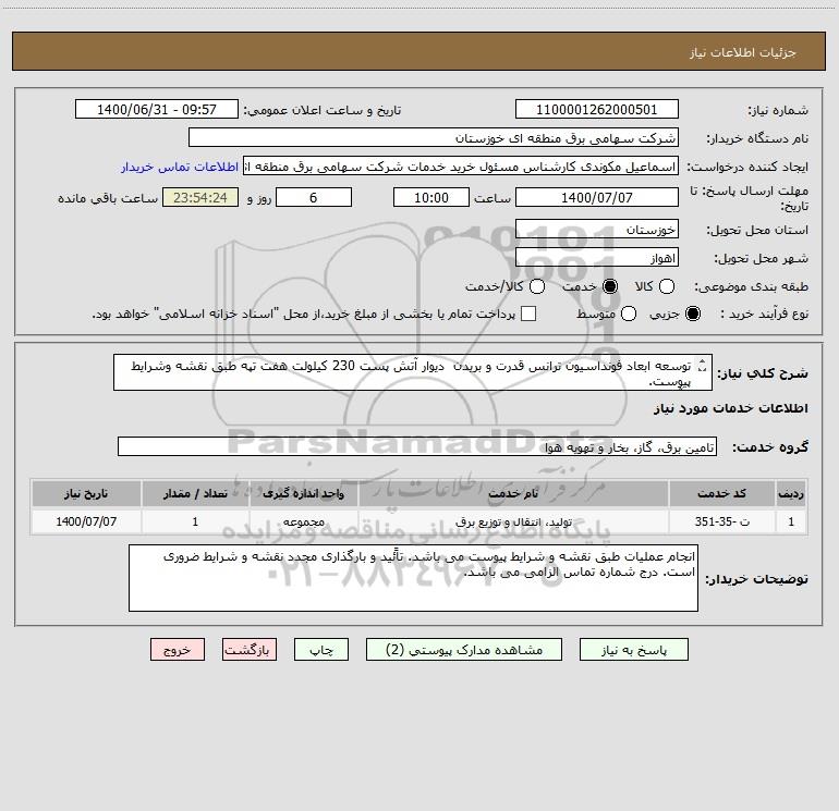 شرح کلی نیاز: توسعه ابعاد فونداسیون ترانس قدرت و بریدن دیوار آتش پست 230 کیلولت هفت تپه طبق نقشه وشرایط پیوست.