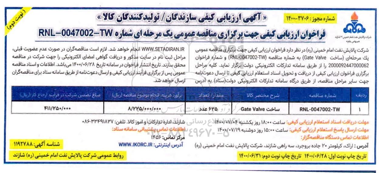 | RNL- 0047002-TW | ساخت gate valve | 625 عدد | 8.225.000.000 | 411.250.000 |