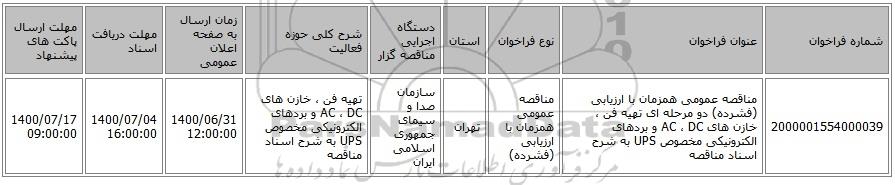 | 2000001554000039 | مناقصه عمومی همزمان با ارزیابی (فشرده) دو مرحله ای تهیه فن ، خازن های AC ، DC و بردهای الکترونیکی مخصوص UPS به شرح اسناد مناقصه | مناقصه عمومی همزمان با ارزیابی (فشرده) | تهران | سازمان صدا و سیمای جمهوری اسلامی ایران | تهیه فن ، خازن های AC ، DC و بردهای الکترونیکی مخصوص UPS به شرح اسناد مناقصه | 1400/06/31 12:00:00 | 1400/07/04 16:00:00 | 1400/07/17 09:00:00 |