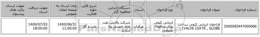 | 2000092447000066 | فراخوان ارزیابی کیفی ساخت VALVE (GATE , GLOBE) | ارزیابی کیفی برای مناقصه عمومی | مرکزی | شرکت پالایش نفت امام خمینی ره شازند | نفت و گاز | 1400/06/31 11:00:00 | 1400/07/03 18:00:00 |