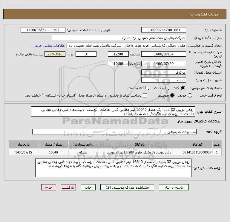شرح کلی نیاز: روغن توربین 32 باپایه یک مقدار 16640 لیتر مطابق کپی تقاضای پیوست / پیشنهاد فنی ومالی مطابق مشخصات پیوست ارسالگردد/ پالت شده باشد/