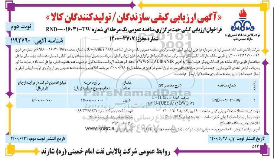 شرکت پالایش نفت امام خمینی (ره) در نظر دارد فراخوان ارزیابی کیفی جهت برگزاری مناقصه عمومی یک مرحله ای (ساخت 1884 - TUBE E- U) به شماره RND- 0016031-TW و شماره فراخوان 2000092447000061 را از طریق سامانه تدارکات الکترونیکی دولت برگزار نماید کلیه مراحل برگزاری فراخوان ارزیابی کیفی از دریافت و تحویل اسناد استعلام ارزیابی کیفی تا ارسال دعوت نامه جهت سایر مراحل مناقصه از طریق درگاه سامانه تدارکات الکترونیکی دولت ستاد به آدرس ستاد ایران انجام خواهد شد لازم است مناقصه گران در صورت عدم عضویت قبلی مراحل ثبت نام در سایت مذکور و دریافت گواهی امضای الکترونیکی ار جهت شرکت در مناقصه محقق سازند تاریخ انتشار فراخوان در سامانه تاریخ 1400.6.28 می باشد اطلاعات و اسناد مناقصه عمومی پس از برگزاری فرایند ارزیابی کیفی و ارسال دعوتنامه از طریق سامانه ستاد به مناقصه گران ارسال خواهد شد